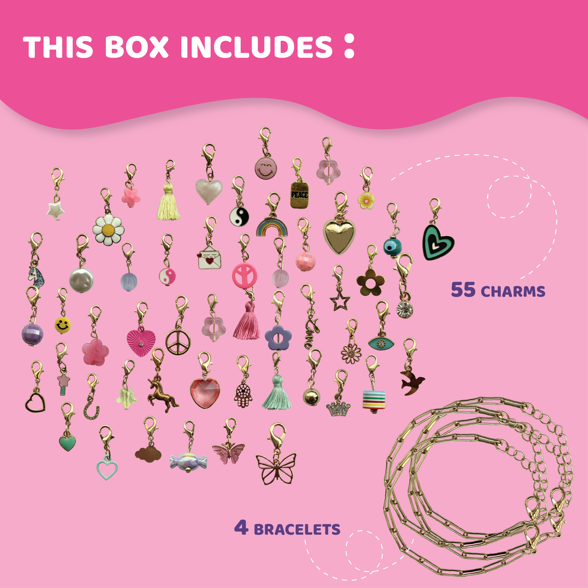 - Charm bracelet making kit: Includes materials to make 4 Bracelets that can be decorated with 55 different charms. Our charm bracelet kit is designed to ignite the imagination making it the perfect jewelry craft kit.