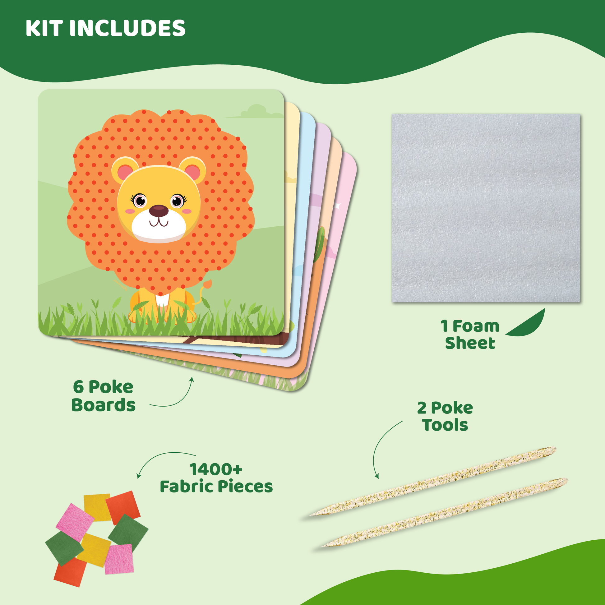 - COMPREHENSIVE KIT: Includes 1400+ fabric squares, 6 foam boards with animals, 2 poke-in sticks, a poke-in pad, and an instruction manual, providing everything needed for a fun and complete craft experience.